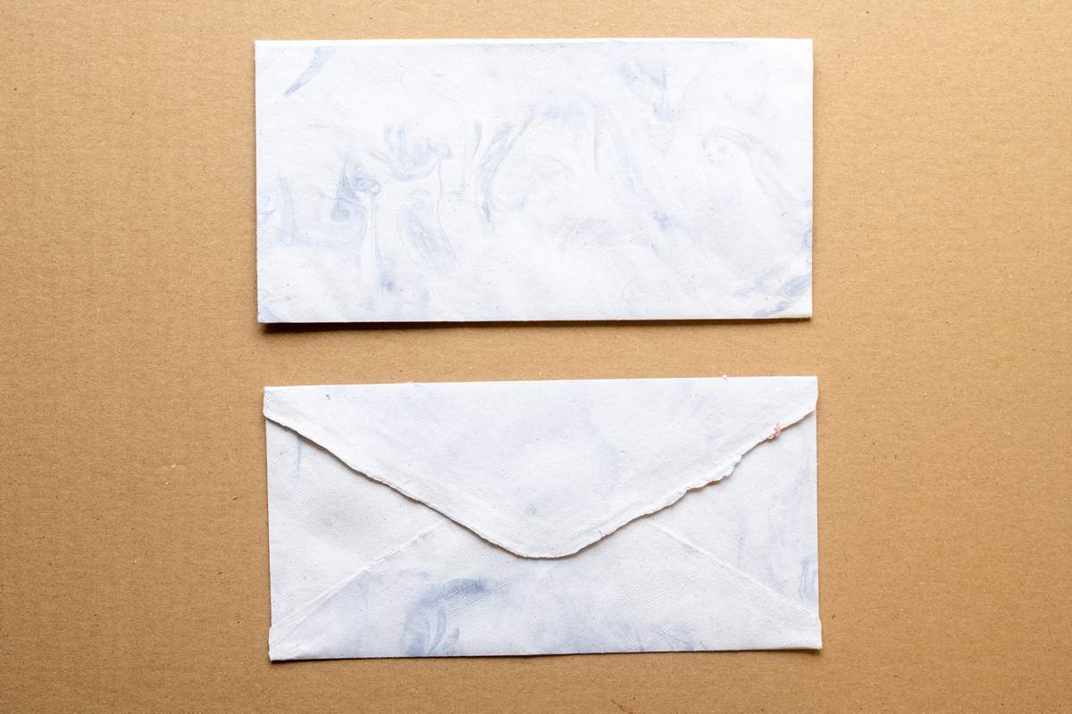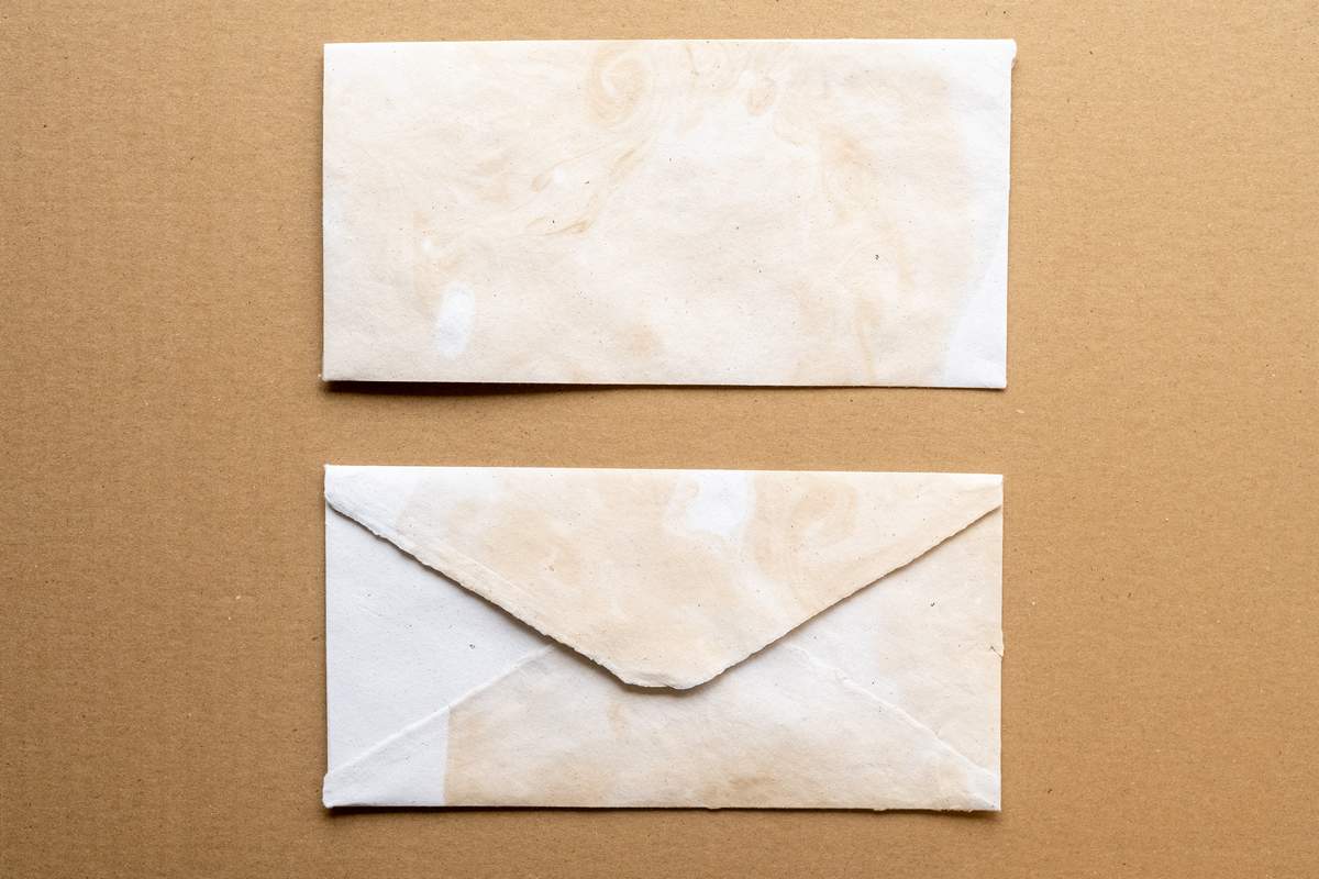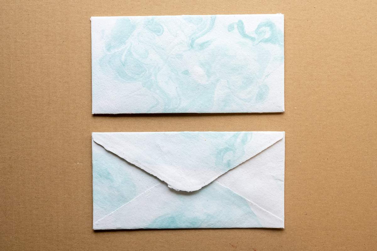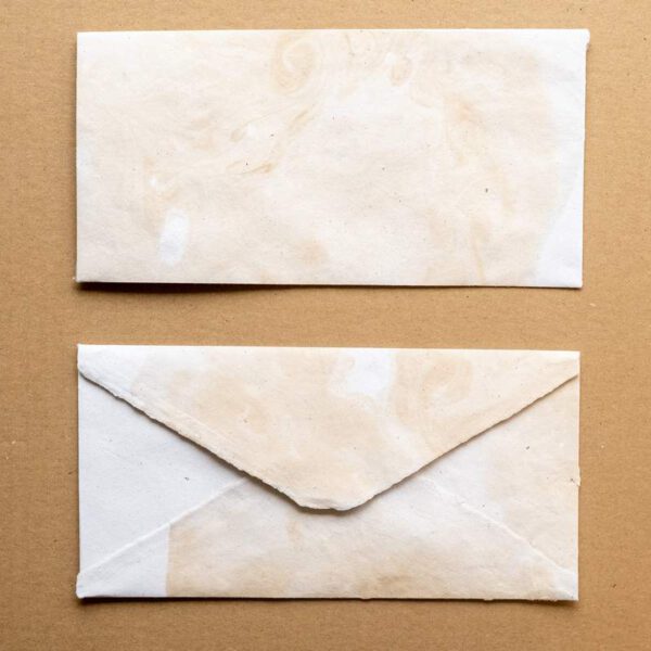 Kézzel készült, márványos kinézetű csekkes papírboríték rétegzett színekkel és elegáns, organikus felülettel. Újrahasznosított papírból készül, különleges megjelenéssel hivatalos és személyes küldeményekhez.