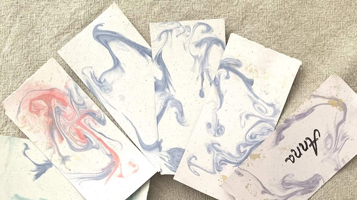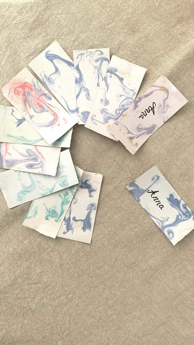 A márványos kinézetű esküvői ültetőkártya felületén a színek finoman rétegződnek, természetes, márványra emlékeztető mintázatot alkotva. A kézi merítésnek köszönhetően minden kártya kissé eltérő mintát kap, így nincs két teljesen egyforma darab.