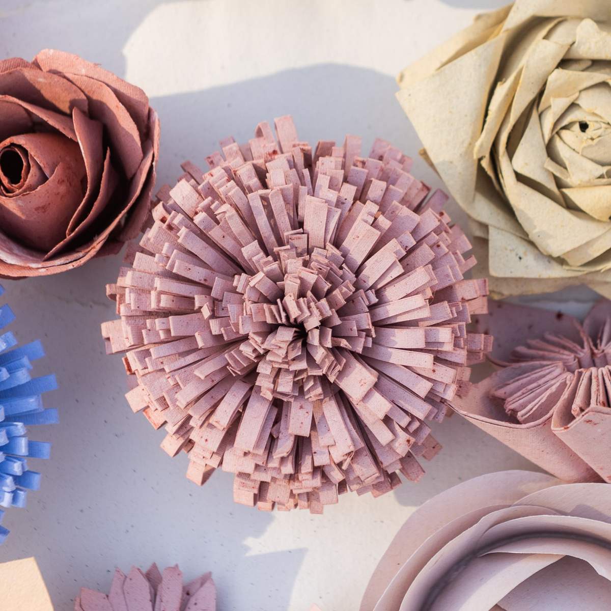 A pom pom krizantém papírvirág gömbölyű, sűrűn rétegzett formájával azonnal magára vonja a figyelmet. Kézzel készül, merített papírból, így minden darab egyedi: a hajtások finom eltérései és a papír textúrája adják meg karakterét.