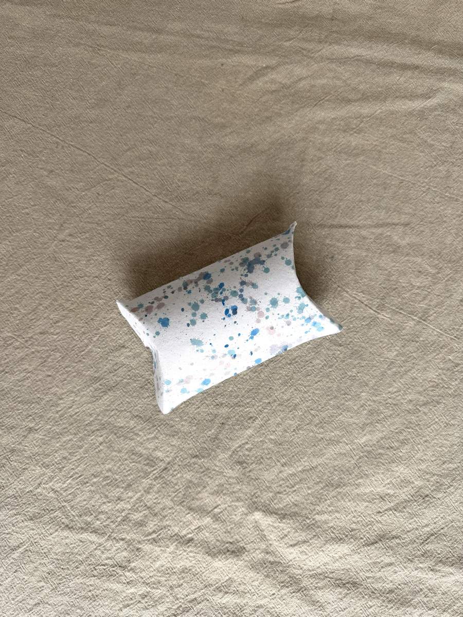 A cseppentett merítésű párna doboz felületén a színek szabadon, véletlenszerűen rendeződnek el, így minden darab egyedi mintázatot kap. A cseppentett technika könnyed, vidám hangulatot kölcsönöz a doboznak, amely önmagában is díszítő elemként működik.