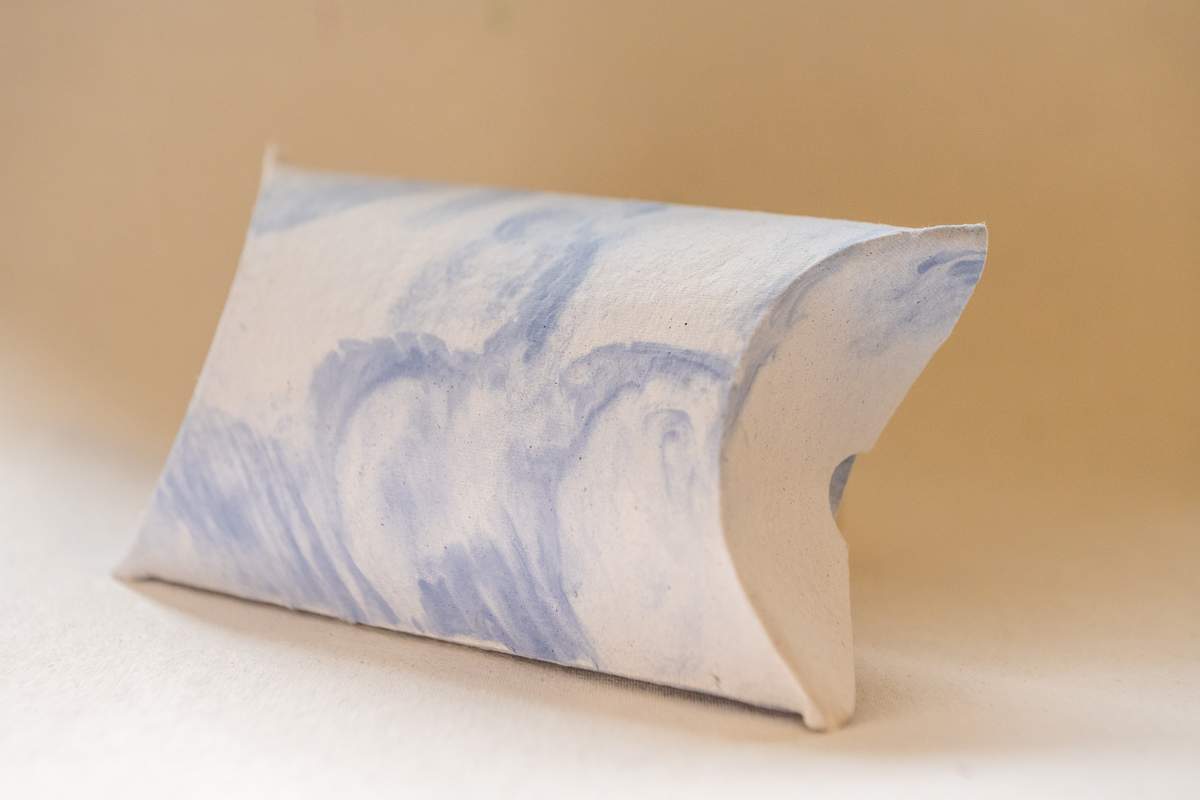 A márványos merítésű párna doboz borítóján a színek finoman rétegződnek, természetes, márványra emlékeztető hatást keltve. A kézi merítésnek köszönhetően minden darab kissé más mintázatot kap, így nincs két teljesen egyforma doboz.