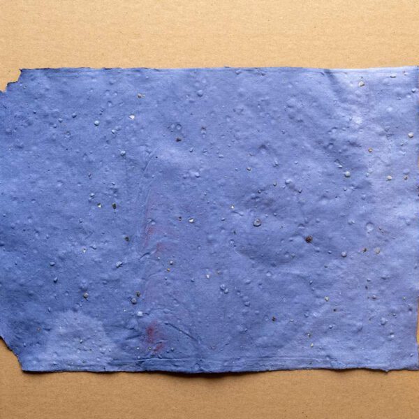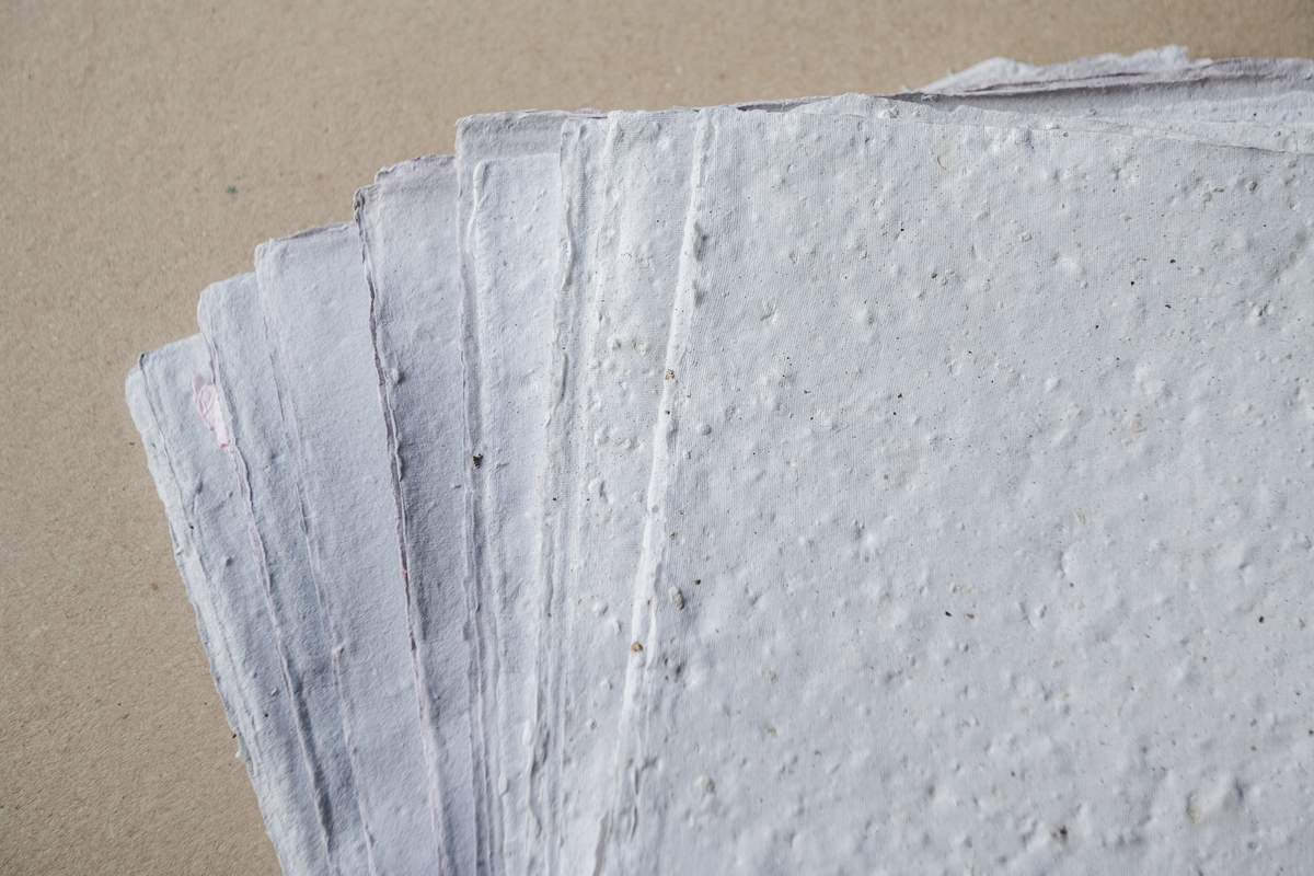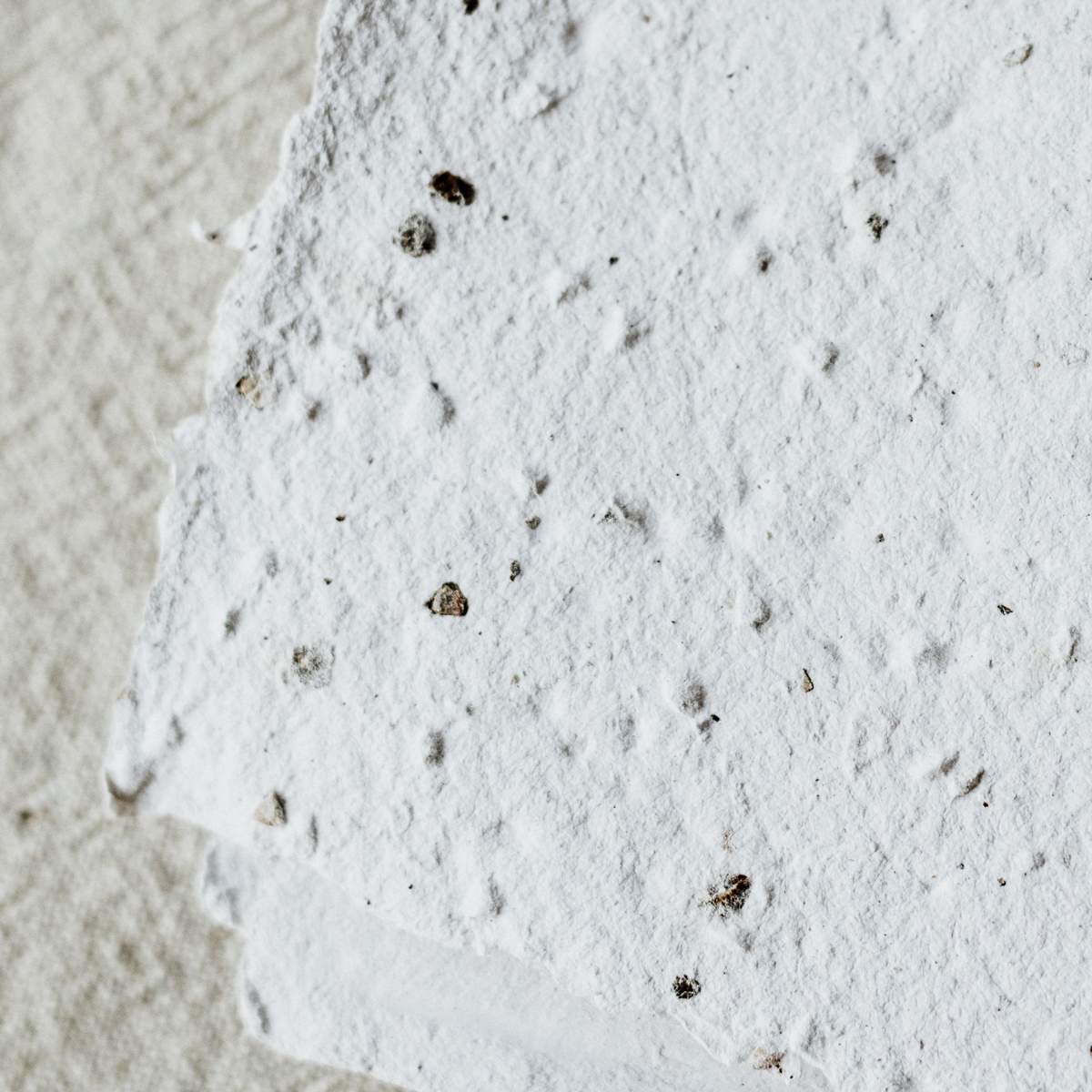 Markáns tapintású felület, ahol az anyag maga is a látvány része: a belémborsos textúra karaktere azonnal érezhető. A kézi merítés során a természetes elemek szabadon rendeződnek el, így minden papírlap saját, megismételhetetlen mintázatot hordoz.